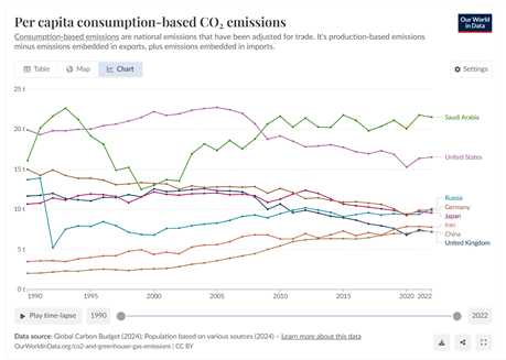 Enquanto que países desenvolvidos como os Estados Unidos, Japão, Alemanha, e Reino Unido demonstram uma diminuição nas emissões de dióxido de carbono nos sectores industrial e energético, países como China, Rússia, Irão, e Arábia Saudita que ainda não se encontram no mesmo nível de desenvolvimento, continuam a apresentar uma curva crescente.