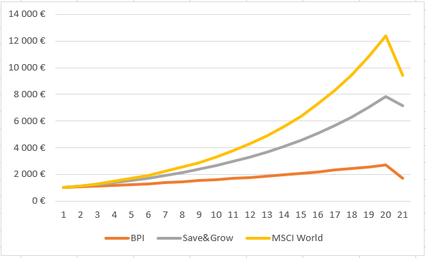 No caso do PPR BPI esta perda é de 1 470€, ou cerca de 34% do valor do activo após os 20 anos. No Save&Grow a perda é de 3 164€, e também cerca de 34% do valor do activo após 20 anos, mas de 1 223€ no ETF MSCI World, representando apenas cerca de 8% do valor do activo após os 20 anos de investimento.