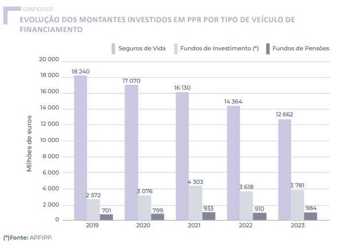 Em sentido contrário, o investimento em PPR’s mais arriscados, através dos veículos de fundos de investimento e de pensões, que geralmente são o tipo de produtos que não oferecem capital garantido, e expectativas de rentabilidade maiores, tem vindo a seguir uma tendência crescente, ainda que tímida.